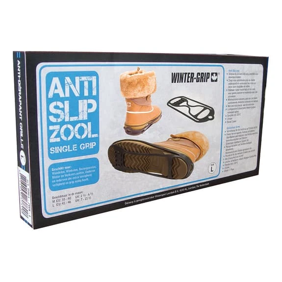 Winter Grip Anti Skid Sole Single Grip Anti Skid Soles are a one-piece, resilient rubber sole with durable, lightweight manganese anti-skid lugs on the front. They will help you step safely on ice, snow or bare pavement to reduce the risk of injury from slips and/or falls. Fits most shoes and boots.