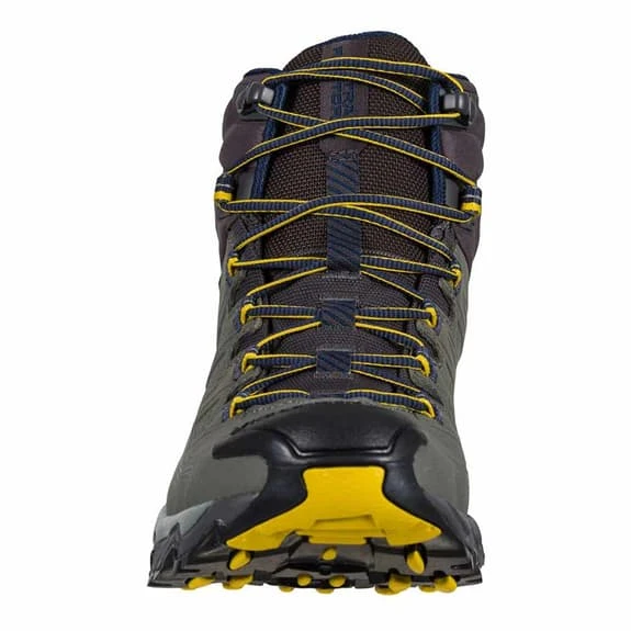 The La Sportiva Ultra Raptor II Mid Leather GORE-TEX boots are ideal for fast hikes and excursions with light loads. Waterproof and breathable thanks to the GORE-TEX Extended Comfort membrane. Perfect regulation of the volume and envelopment of the foot thanks to the special lacing system: the loops are sewn inside the upper and reinforced on the outside with high-frequency reinforcements: this system allows the lacing tension to be reset on the entire upper. Featuring FriXion Blue outsole in a highly abrasion resistant compound with pronounced Trail Bite Heel for improved braking on descents.