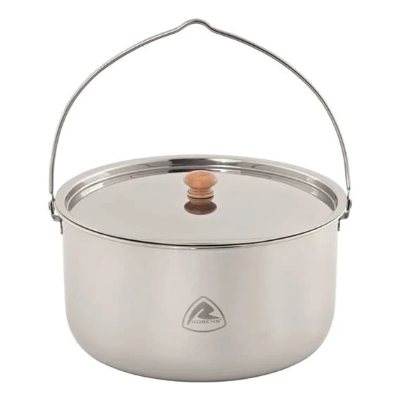 The Robins Outback Ottawa Pot 6L is made from strong stainless steel and includes a special upper handle with a hook attachment point. The wooden knob helps protect hands from heat.